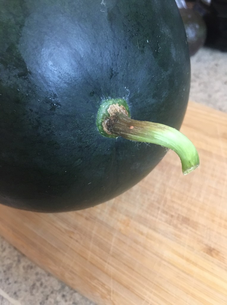 That’s right! I’m different and I have my damn ways people! You may already know one can tell the ripeness by the “drum”sound, the yellow spot and the first dried up tendril. I guess I CAN argue the yellow spot. Like a caring mother, I turned and picked up my baby from time to time to hear it’s heart beating, or maybe I’m just impatient, so he didn’t really develop the “yellow spot”. You may see from the picture below, it’s “tail” started turning brown and that is how he told me “Ma, I had a great life, let’s celebrate!”
