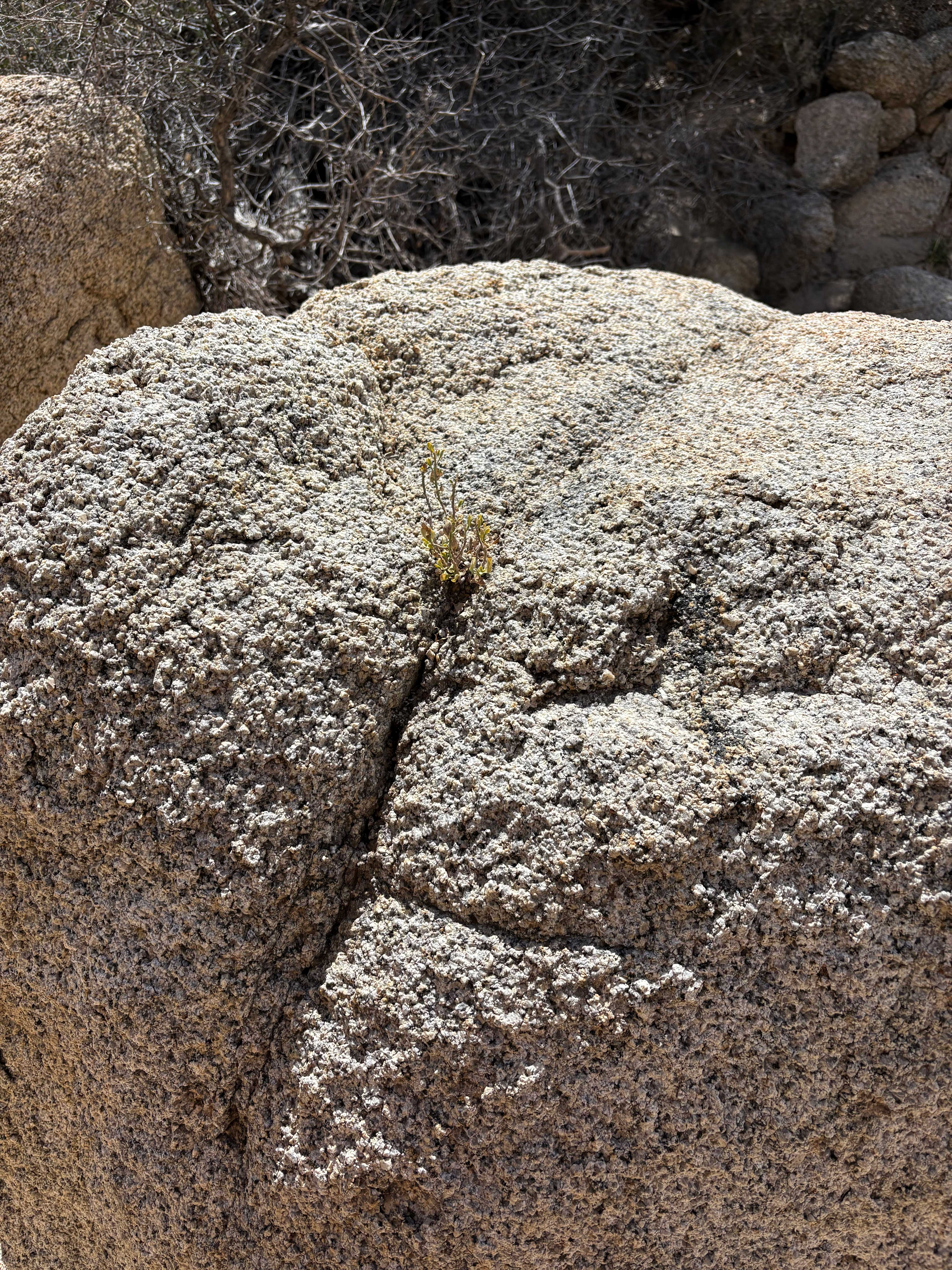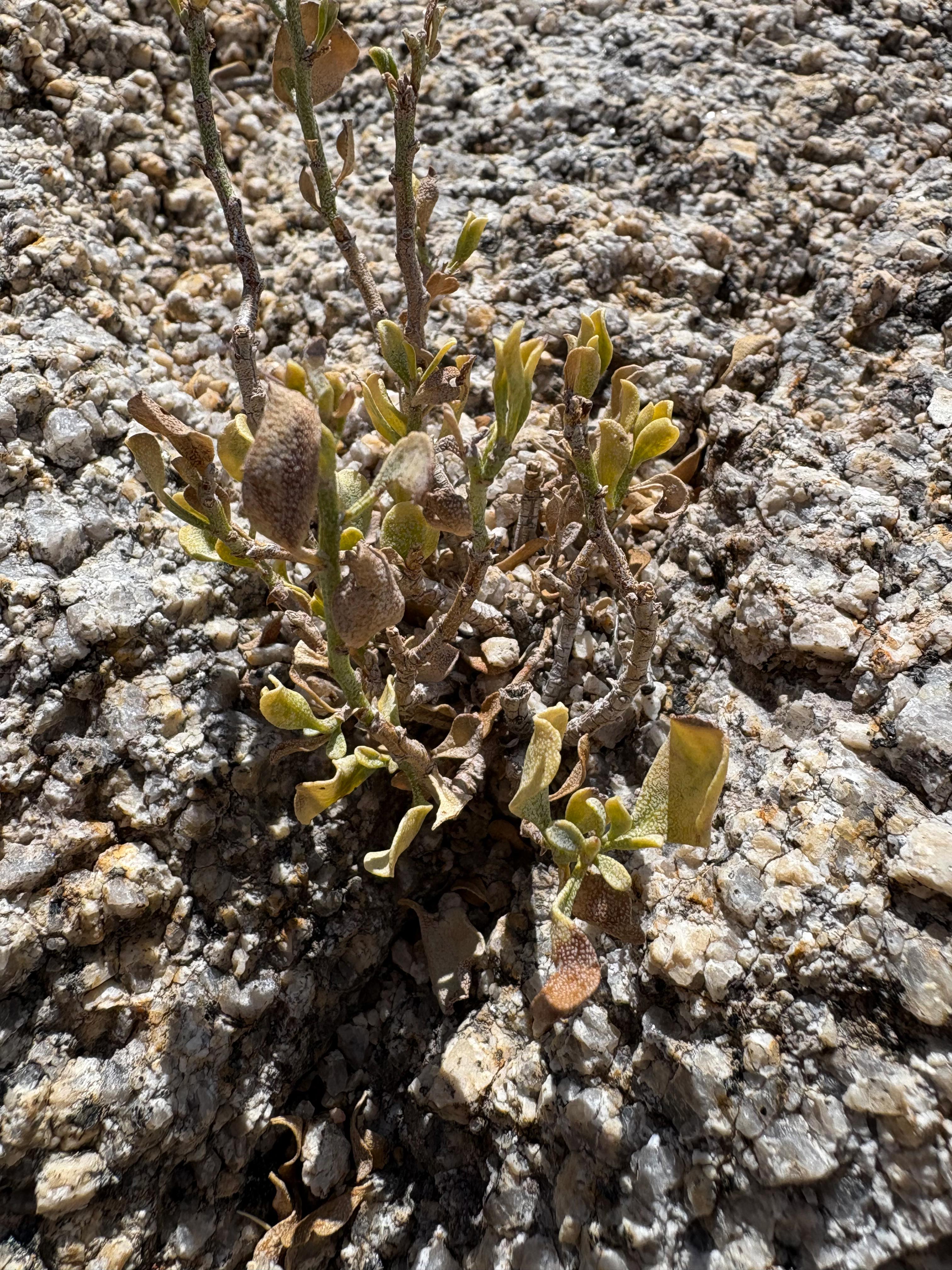 Cliff Goldenbush, Ericameria Cuneata, growing through Granite Rock, Mojave
